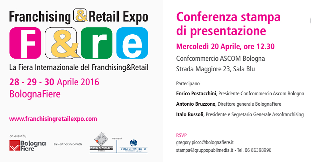 La Conferenza Stampa di Presentazione di Franchising&Retail Expo si terrà mercoledì 20 aprile alle ore 12.30 presso la sede di Confcommercio ASCOM Bologna, Strada Maggiore 23, Sala Blu.